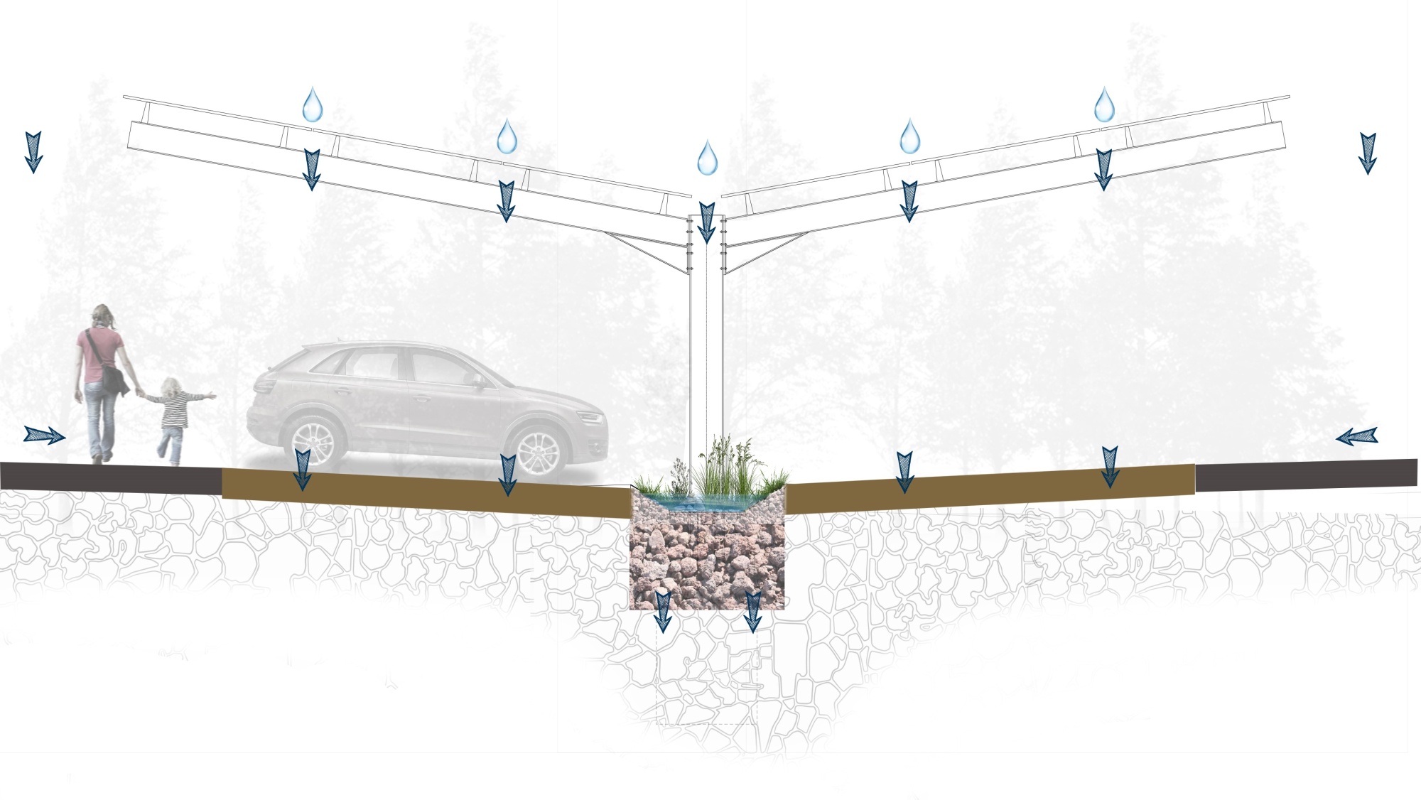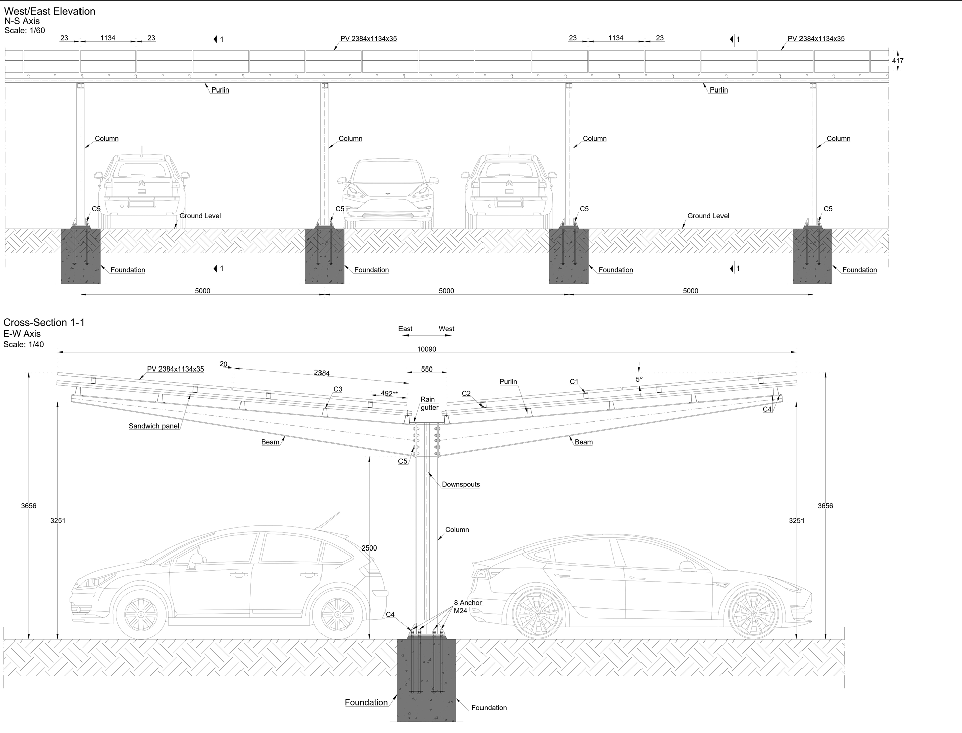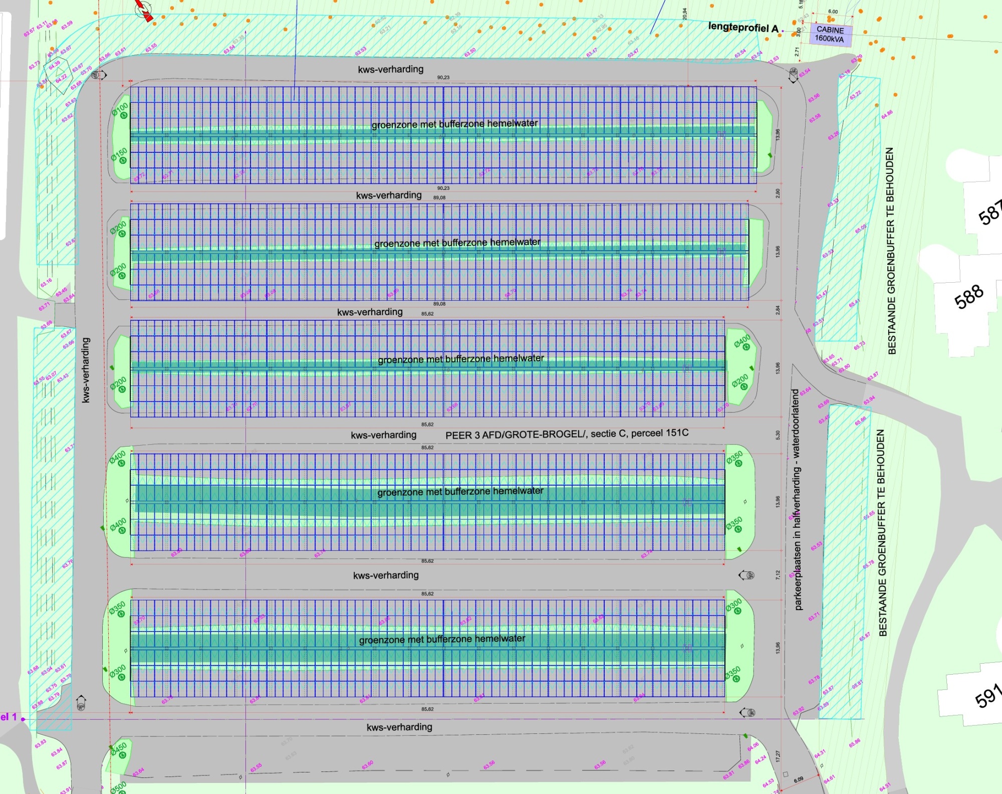 Het tweede deelproject omvat de bouw van een grootschalige PV‑carport boven de bestaande bezoekersparking 2. Hier is een stalen draagstructuur van meer dan 6.000 m² voorzien, uitgerust met 2.262 bifaciale zonnepanelen die samen een vermogen van circa 1,335 MWp genereren. Deze installatie is rechtstreeks gekoppeld aan een nieuw geplaatste hoogspanningscabine en via een ondergrondse verbinding aangesloten op de bestaande koppelcabine. De volledige parkeerfunctie blijft behouden, terwijl de structuur zowel beschutting biedt als duurzame energie opwekt voor het recreatiedomein. Ook hier werd aandacht besteed aan omgevingszorg: 11 te rooien bomen worden gecompenseerd door 30 nieuwe aanplantingen, en de groenstroken tussen de parkeerrijen worden geoptimaliseerd als infiltratie‑ en bufferzones. De carport heeft een maximale hoogte van 5,35 meter, wordt landschappelijk ingekaderd door bestaande groenbuffers en blijft hierdoor visueel discreet.