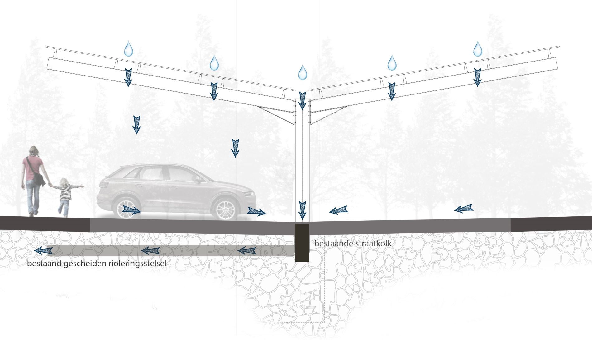 De carport bestaat uit een lage staalstructuur met een maximale hoogte van vier meter, voorzien van houten eindafwerkingen die het geheel visueel laten aansluiten op de groene recreatieve omgeving. De zonnepanelen zijn zodanig gepositioneerd dat hemelwater op natuurlijke wijze kan infiltreren in de bodem, waardoor de gewestelijke hemelwaterverordening niet van toepassing is. Het regenwater wordt opgevangen door de open zones tussen de panelen en infiltreert rechtstreeks in de bestaande groenzones en waterdoorlaatbare verhardingen. De technische installatie wordt aangesloten op een nieuwe prefab hoogspanningscabine die voldoet aan de Synergrid‑specificaties en via ondergrondse kabels verbonden wordt met de bestaande koppelkabine.